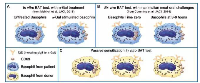 盡管嗜堿性細胞活化試驗有高AUC,不太可能有一個具有高靈敏度和高特異性的單一的臨界點來預測哪些對α-半乳糖敏感的受試者是臨床過敏的。例如,0.227 ng / mL的刺激濃度是豬腎BAT的最佳條件之一(AUC = 0.95), α-半乳糖綜合癥受試者的陽性率是57%,敏感組中的陽性率為0 (用15%嗜堿性細胞陽性作為臨界點)。相比之下,商業明膠制劑皮內皮膚試驗結果(4% Gelafundin [B. Braun; Melsungen AG, Melsungen, Germany]) :93%的α-Gal綜合癥受試者陽性,但在無癥狀的敏感者中只有13%的陽性率。因此,皮內皮膚試驗比BAT有更高的敏感性,但只是在特異性上略有損失。血清sIgE檢測與皮內檢測結果相似,通過計算α-半乳糖特異性IgE占總IgE的百分比,用3%α-半乳糖特異性IgE作為臨界值(90% vs 17%),盡管如此,Mehlich等人工作的一個真正的優點是在一個定義良好的患者群體中對不同的測試方式進行面對面的比較。需要進一步考慮的是,有關對α-半乳糖的IgE敏感性可能存在比速發型過敏反應還要嚴重的健康風險的可能性。這源自一個最近的報告,它證實了α-半乳糖特異性IgE與冠狀動脈疾病之間的相關性。盡管研究對象很少,目前也沒有機理研究來支持這一觀察結果,但這種聯系在生物學上是可信的。解釋兩者之間關聯性的工作模型顯示,慢性攝入那些敏感的α-半乳糖可能導致持久的冠狀動脈壁的慢性炎癥。雖然目前數據還不足以提出建議來改變臨床實踐,這項研究使我們在給α-半乳糖敏感患者飲食建議時引起注意,尤其是那些已經具有心臟病危險因素的患者。超出了BAT可能的臨床價值,或許當前報告與建議的最大貢獻是建議對α-半乳糖生物學的關注。以前,它提出了腸道微生物群,腸道屏障功能,或全身代謝的差異可以解釋為什么一些α-半乳糖敏感受試者對哺乳動物產品有臨床反應而另一些人不會。盡管目前的工作并不排除這些可能性,有趣的是,α-Gal綜合癥患者的類胰蛋白酶水平顯著升高,而嗜堿細胞活化程度處于基線。這表明反應者和耐受者之間的差異可能是由于過敏效應細胞(如肥大細胞和嗜堿性細胞)的固有活化程度的差異,這與最近卡特等的報告相一致。還有一點重要的是,不能低估特異性IgE滴度和親和性所起的作用??傊?,在本研究隊列中,α-半乳糖綜合癥患者血清檢測的滴度明顯升高。用被動致敏技術進行嗜堿性細胞活化試驗(BAT)可能是另一條途徑。需要再次提醒的是,體外嗜堿性細胞活化試驗(BAT)研究已經提供了重要的機理性證據,支持臨床觀察到的3-6小時的特征性延后反應。