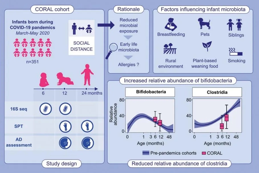 人類體內蘊藏著多種多樣的共生微生物群落,它們在調節宿主代謝反應、上皮屏障功能、免疫教育和免疫調節方面發揮著至關重要的作用。生命早期有一個“免疫機會之窗”,當免疫系統對環境暴露(包括環境影響、營養和微生物群)的反應特別敏感,這些環境暴露有助于建立閾值、反應模式和功能軌跡,從而產生長期影響,包括改變免疫介導疾病的風險。這些微生物與宿主的相互作用會促進適當的免疫反應,從而有效抵御感染,同時對宿主組織造成有限的附帶損害,并且不會產生任何異常的炎癥或過敏反應。有幾種假說認為,微生物暴露的減少與過敏癥發病率的增加有關。在此,我們利用對在疫情期間相關社交距離限制措施期間養育的一組嬰兒(CORAL)進行研究的機會,以確定有助于早期生活微生物群發育的環境暴露和飲食因素,并研究它們與過敏之間的關聯。