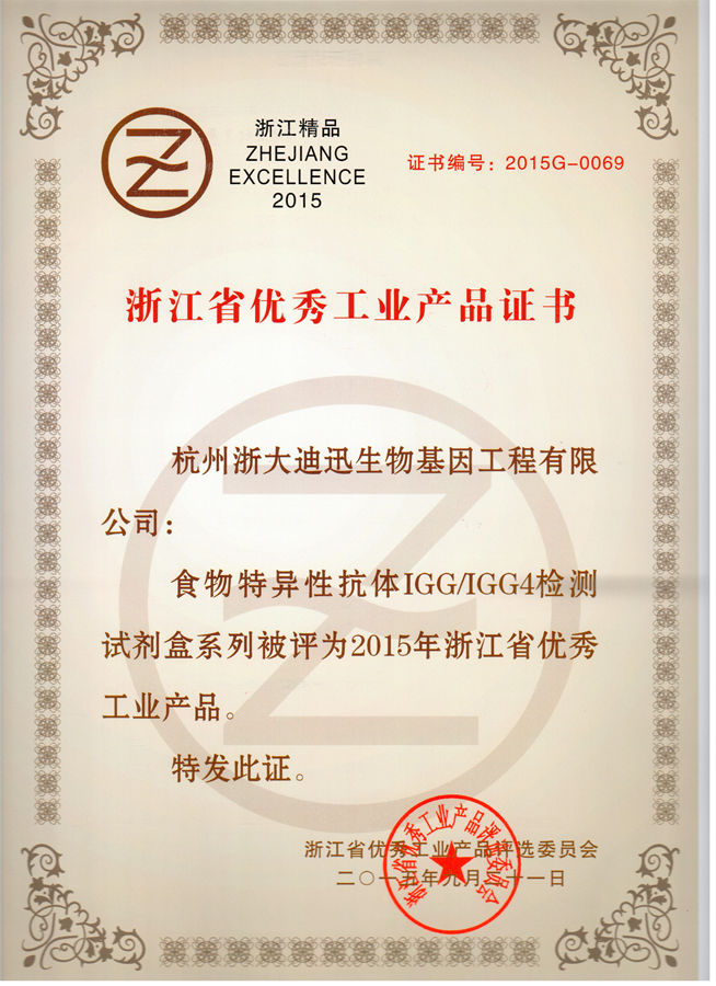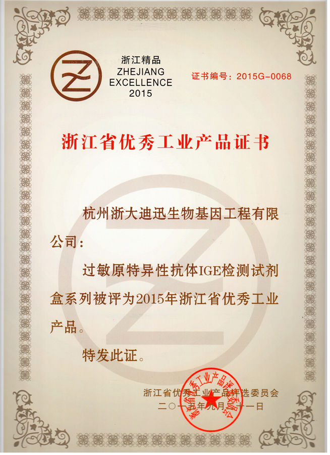 公司于2015年10月12日參加了在杭州之江飯店舉辦的“2015浙江省企業領袖峰會”,浙江省常務副省長袁家軍出席會議并作重要講話,省人大、省政協及相關部門領導蒞臨會議,會上發布并表彰了2015年浙江省優秀工業產品榜單,我公司的“過敏原特異性抗體IgE檢測試劑盒系列”和“食物特異性抗體IgG/IgG4檢測試劑盒系列”均榮獲該項榮譽,表示祝賀!